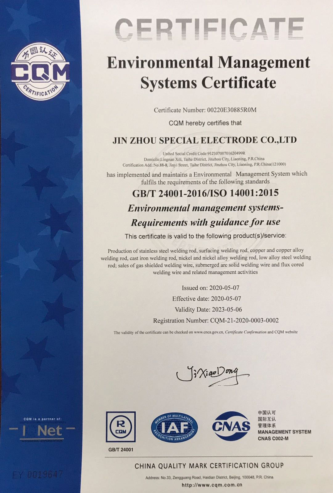 認(rèn)證名稱:環(huán)境管理體系認(rèn)證證書(shū)